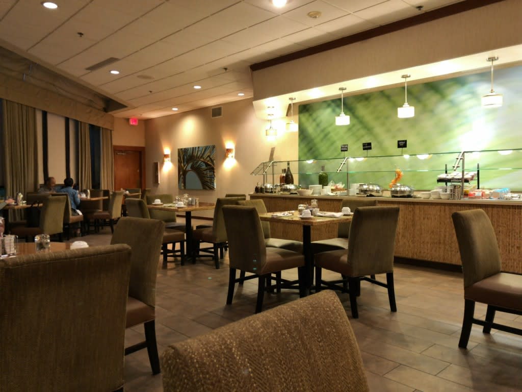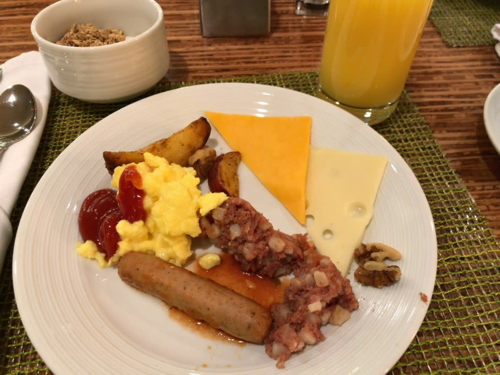 朝食はホテル内のカフェテリアで。朝早かったので空港関係者が半分以上食事を取っていました。
