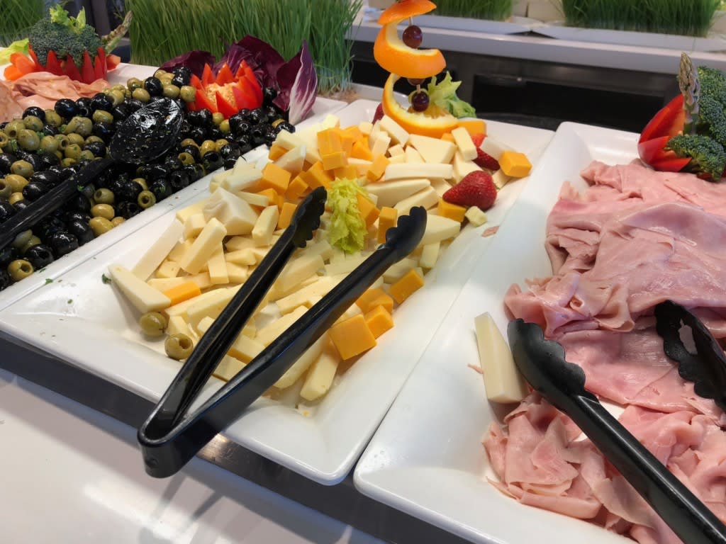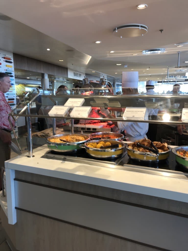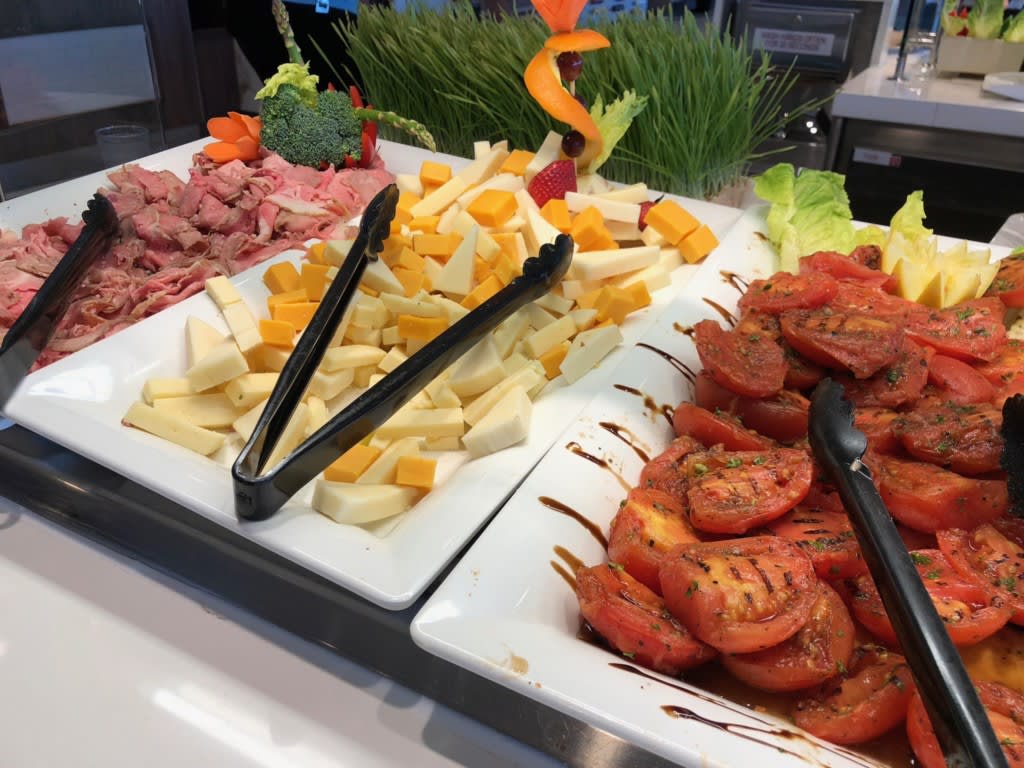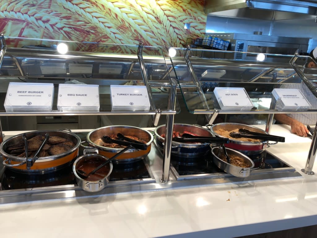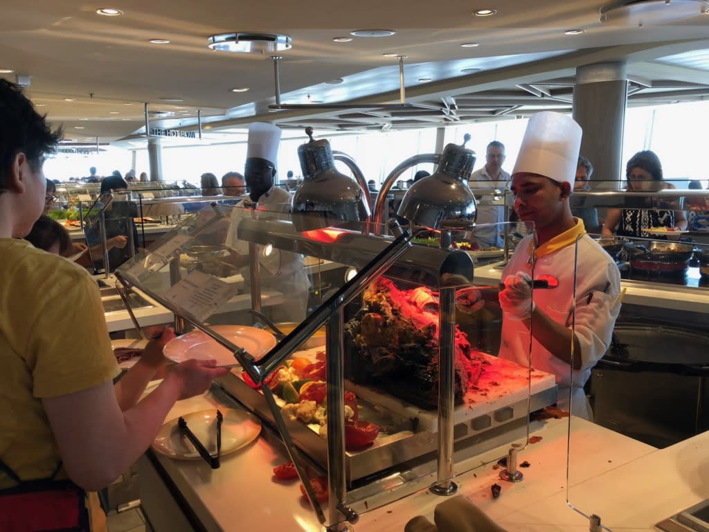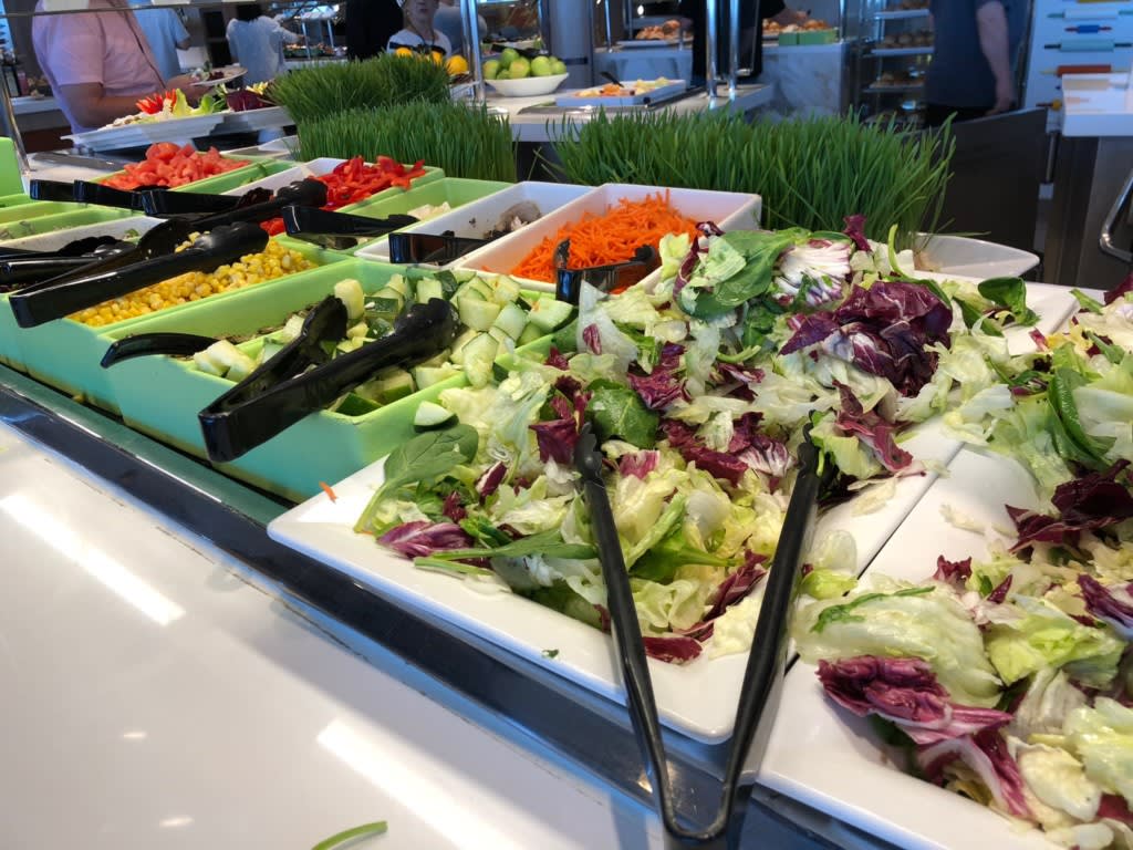 ウィンジャマーカフェのお料理があるブッフェ台は3箇所に(右舷・左舷・後方部)置かれているので、「席からお料理を取りに行くのが遠い」ということもほぼありません。むしろ、ブッフェ台に近くない方が人通りがなく落ち着いて食べられるます。