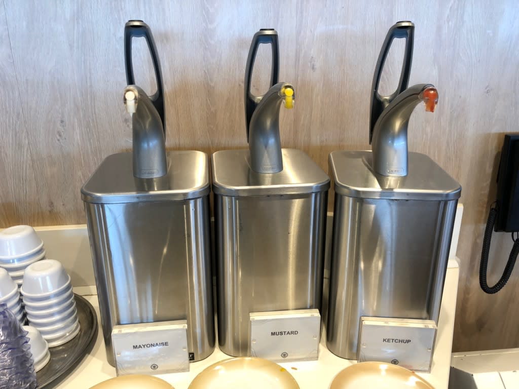最後に好きなだけケチャップやらマスタードやらをかけます!ポンプ式、便利!