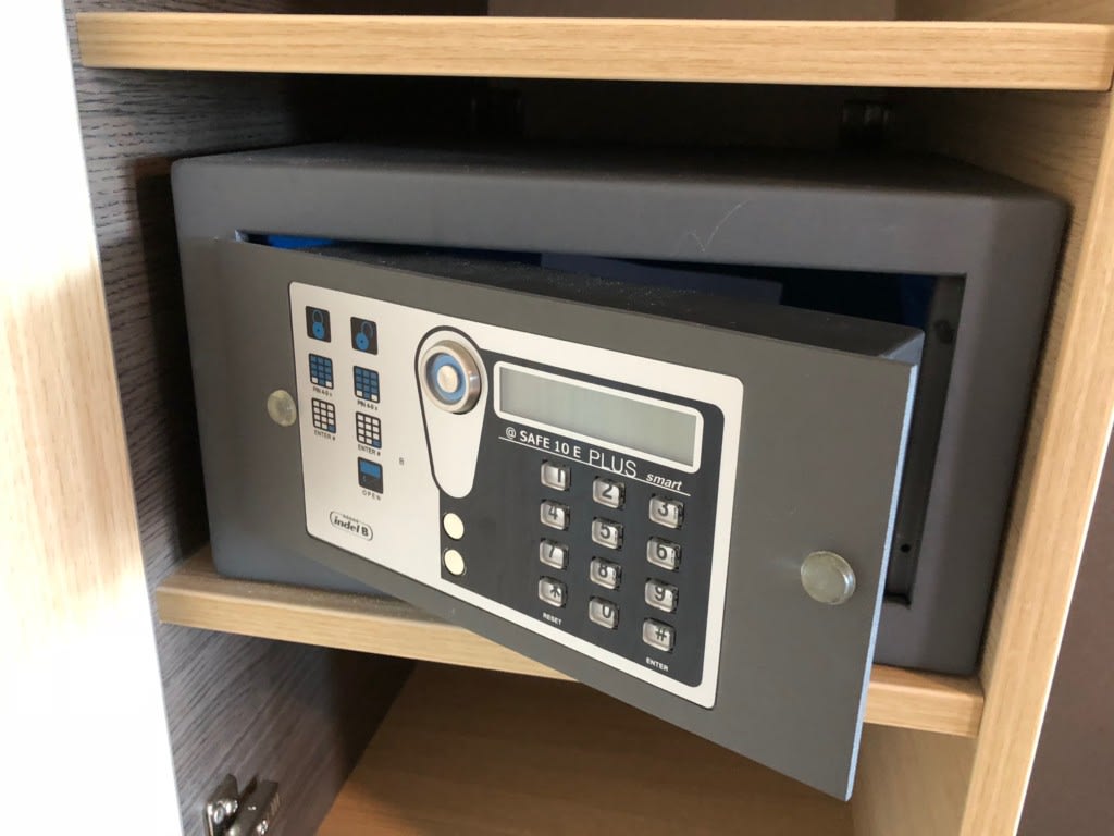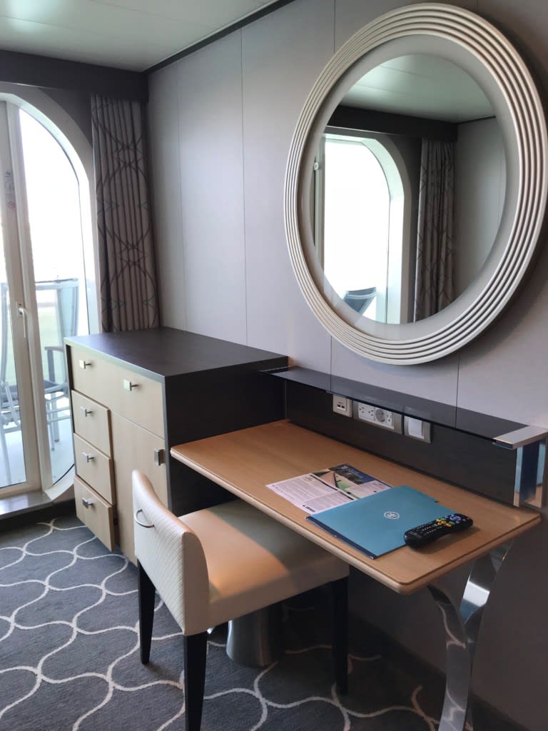 ソファベッドの向かいにはキャビネットと鏡、デスクがあります。よくある船内の分厚い説明書はなし!それは全てベッド前のテレビで見ることができます。ペーパレス!