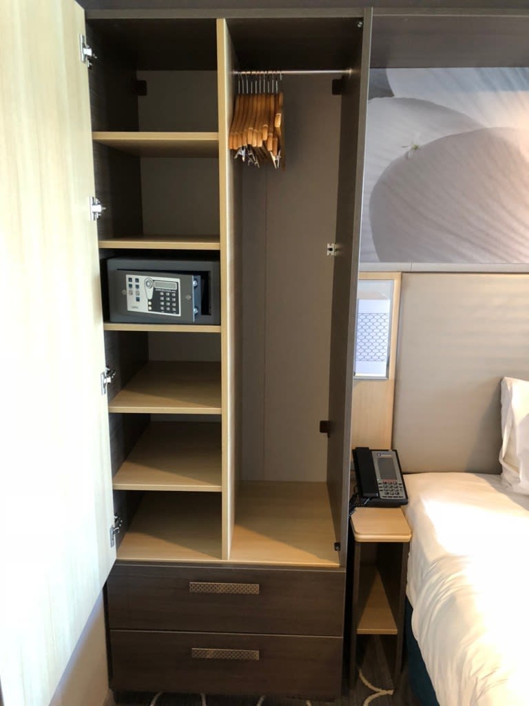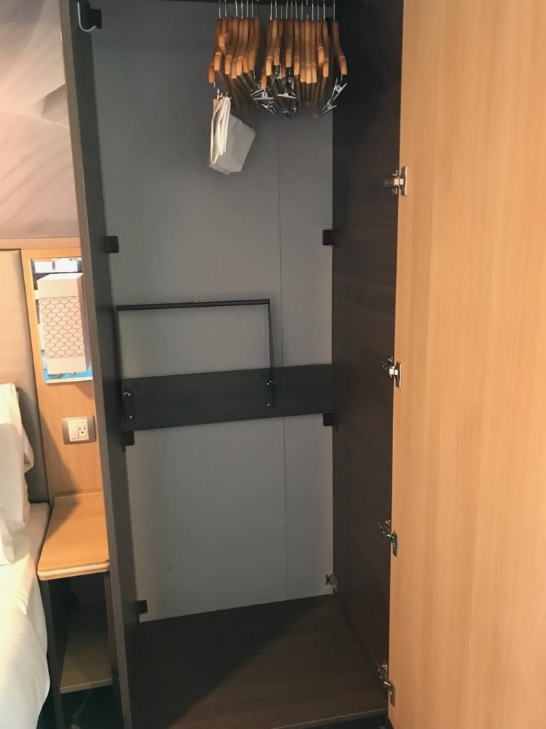 ベランダ側のベッド横にある大きめのクローゼット。下段3/4にもかけられるように引き出し式のバーもありました。ハンガー数も20本近くあり固定式のハンガーではないので使い易かったです。