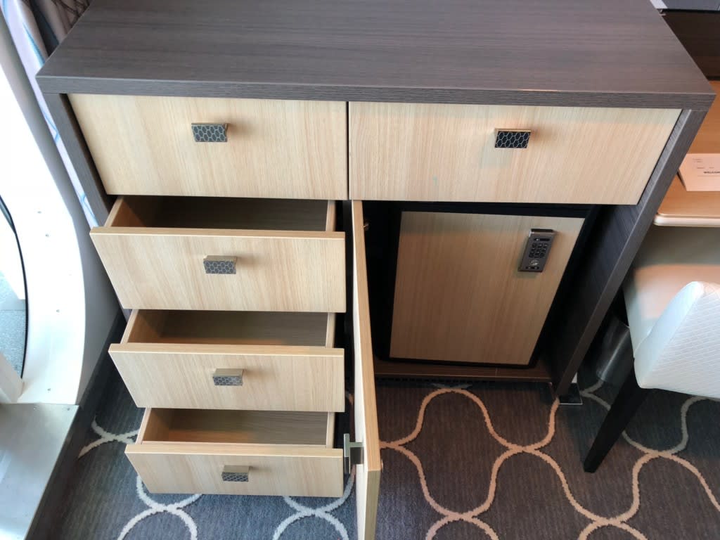 キャビネットの右下は空のミニバー(保冷庫)になっていて、それ以外は全てやや深めの引き出しになっていました。