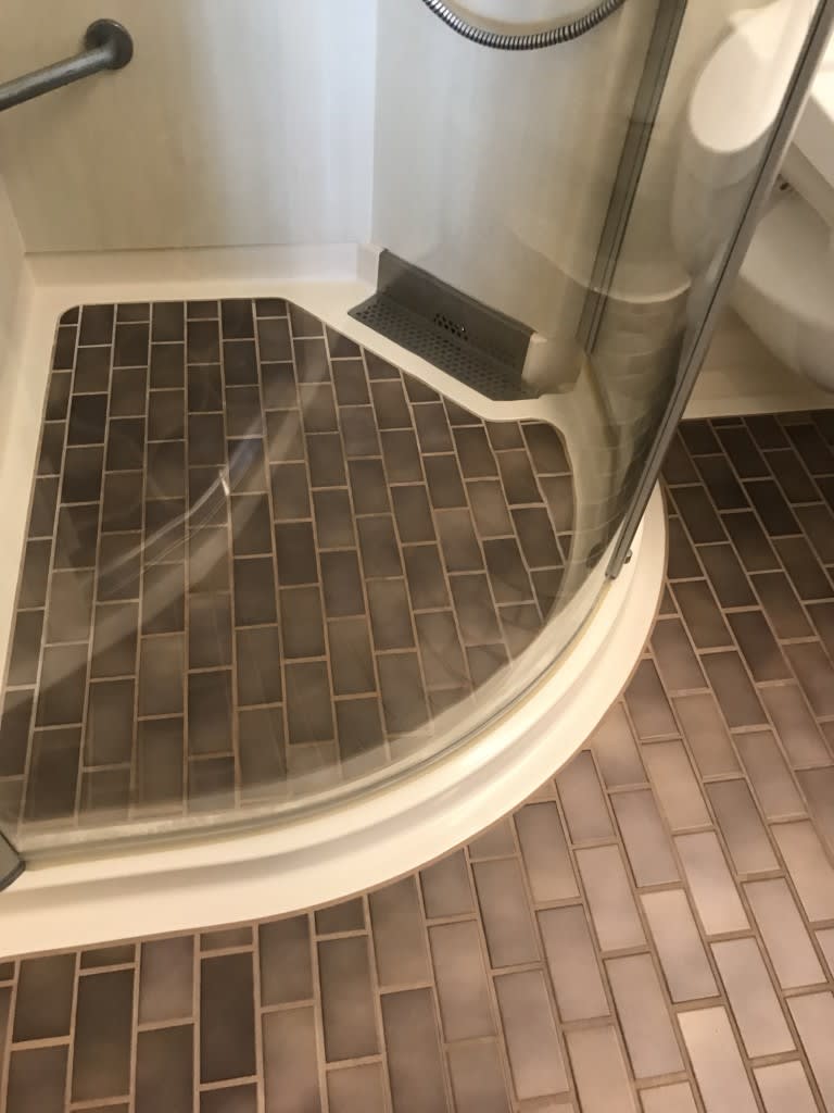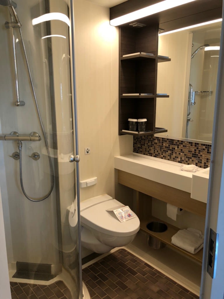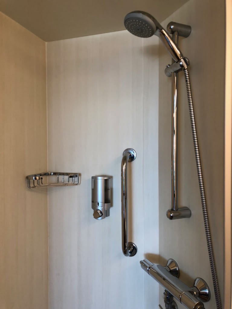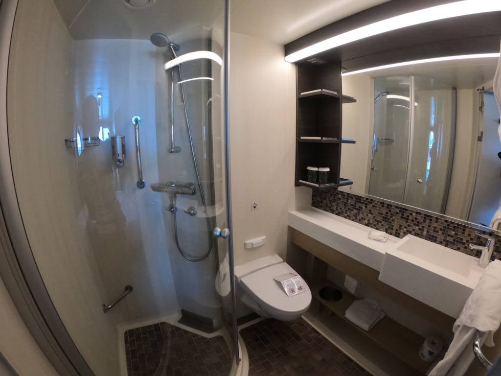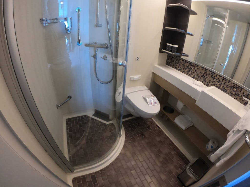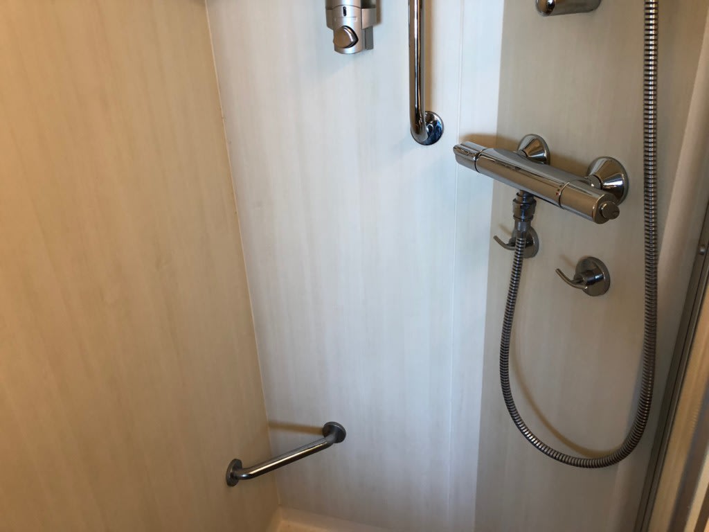 なんと、シャワーブースはカーテンタイプではなく、キッチリとドアが閉まる1/4ドーム型なので洗面所への濡れを配慮しなくていいのが画期的!本当にストレスフルでした。新しい船、バンザイ!素晴らしい!