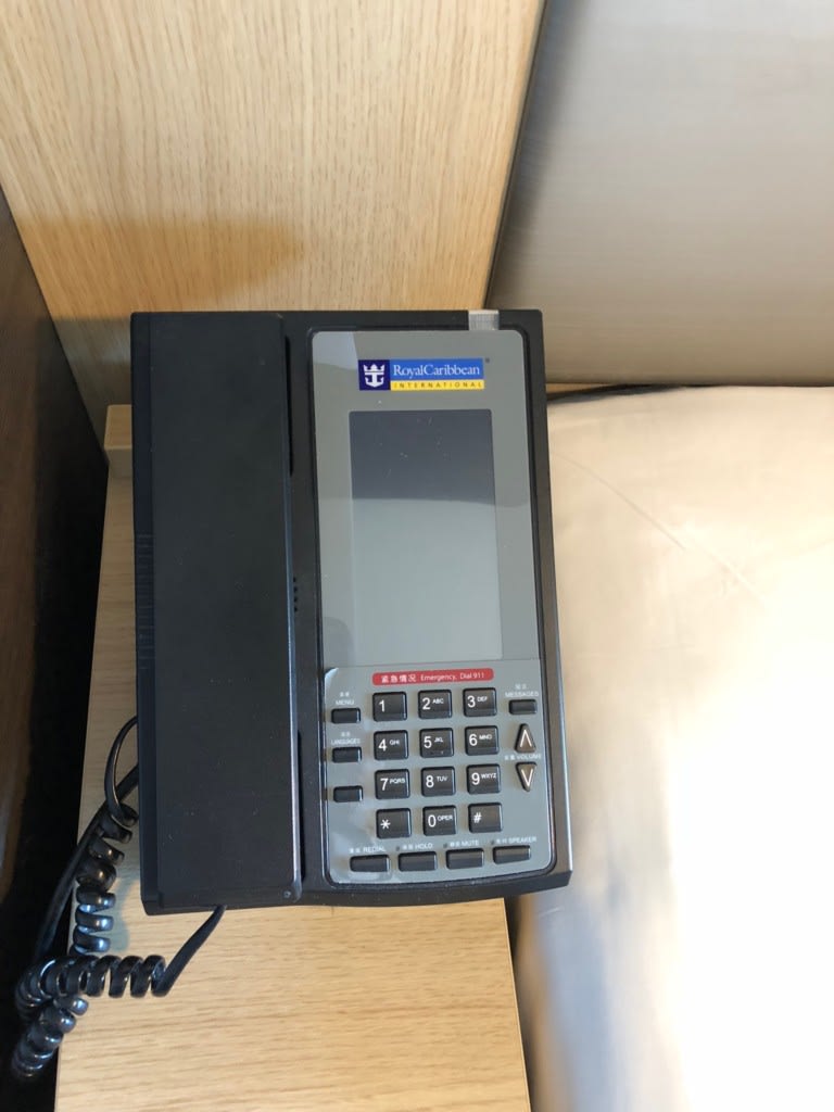 ベッド横に部屋の電話があります。 客室から客室への電話はもちろんのこと、船内にある電話から部屋への電話もかけることも可能です。