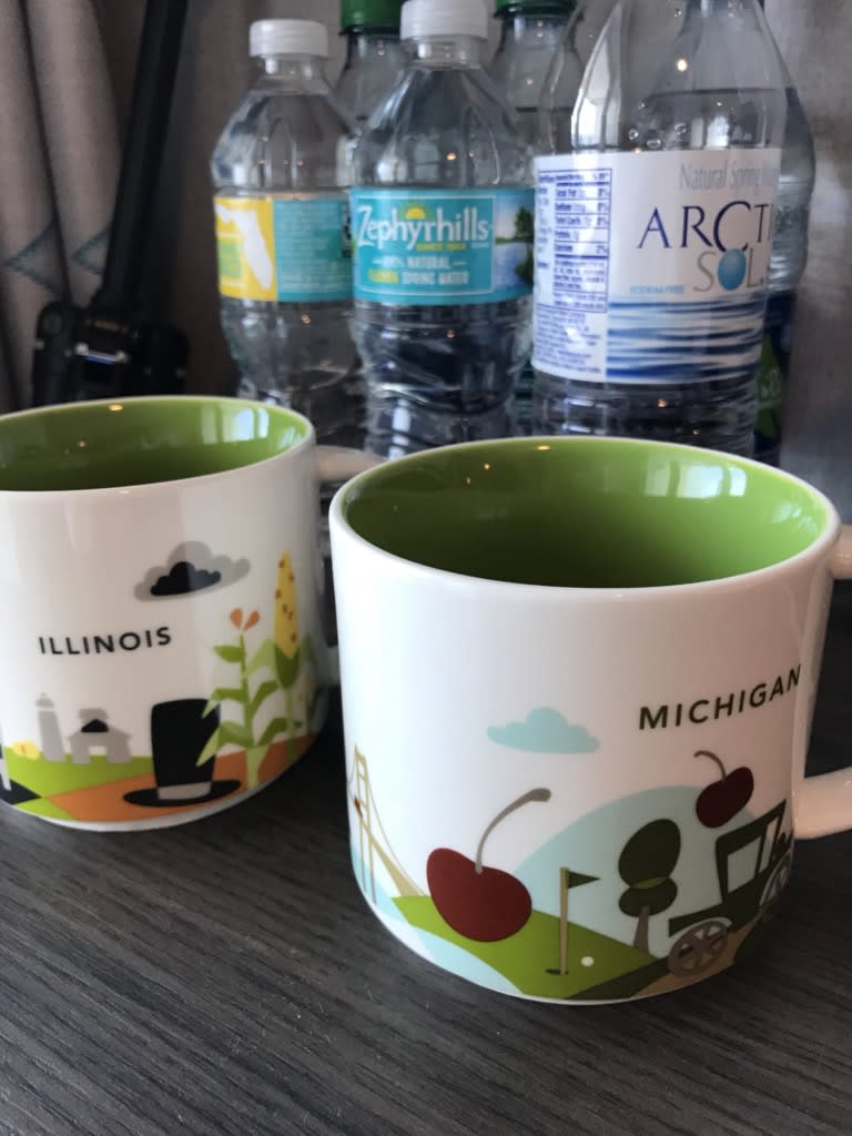 洗面所の水は飲めません!夜中にちょっと水が飲みたい時、ペットボトルの水をコップに入れて飲もうと思ったら「室内にない」ことがわかり…仕方ないのでシカゴ空港のスタバで買ったコーヒーカップを使っていました。