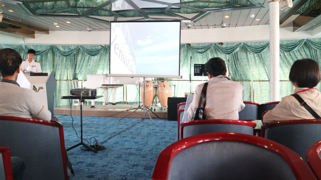 11F船首にあるグラン・シャリオにてこれからのぱしふぃっくびいなすのクルーズツアーの説明会が行われました。