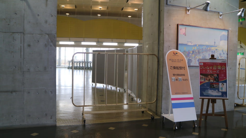 15:30からこの日のクルーズ乗船受付が始まるのに、私たち見学者は14:45分まで船内にいました。ギリギリまで船内にいられることに驚きでした。