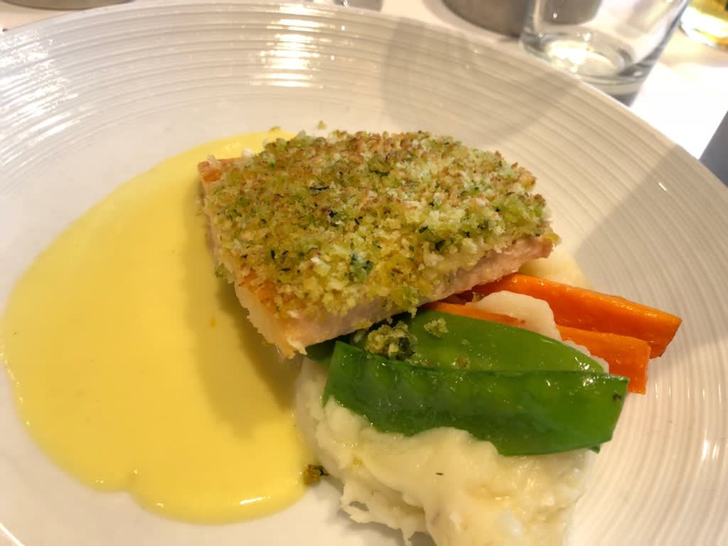 メインは二人ともサーモンのグリルをチョイスしました。サーモンは身が大きくホロホロとほぐれていきます。ソースはクリーム系ですが味に主張がなく全体的に淡白なお料理。