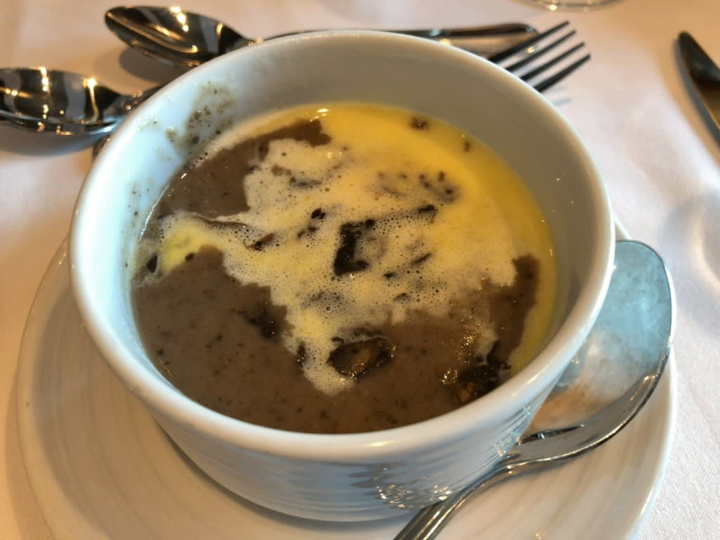 主人の前菜はキノコのスープ、なのですが…なんのキノコだったか覚えていません。キノコスープとスープとしは意外な具材のミックスだったような気がしていますが、メニューを撮らなかったのでうろ覚えです。不覚!ちょっと変わった風味のスープでした。