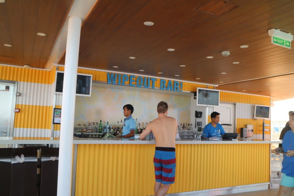 立ち飲みカフェバー。ビールやワインなどを片手にフローライダーの見学といきますか!