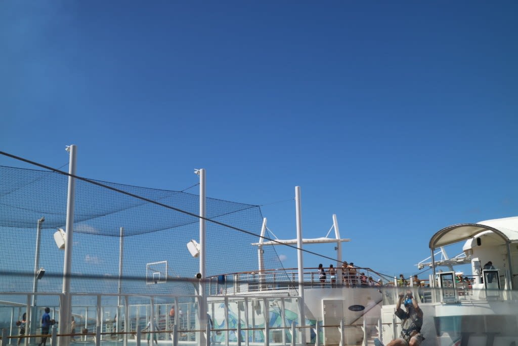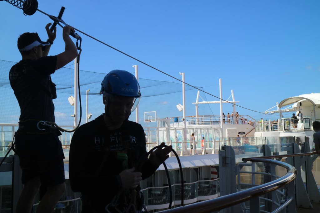 ミニゴルフとバスケットコートの間の短い距離でいささかの恐怖体験?船内のジップラインはテレビで紹介された時よりも短い距離でした。25mの距離だそうですがそれよりも短くみえました。