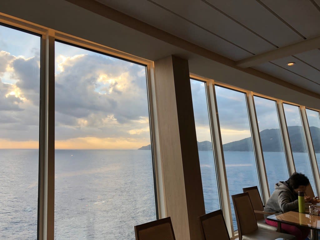 早朝のブッフェはせきが選びたい放題!ただし7:00まで。それ以降はあっという間に人が増え席が埋まっていきます。人が少ない時は窓に向かって並びで食べる贅沢〜。刻々と変わる景色を見ながら食べる海の上での食事はいつでも最高です!