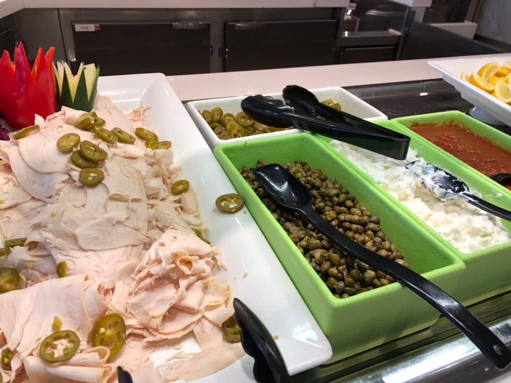 サーモン、ハム類、オリーブは毎食ブッフェにありました。サーモンは肉厚で美味しいのでパンに挟んでも!オリーブもふんだんにありました。