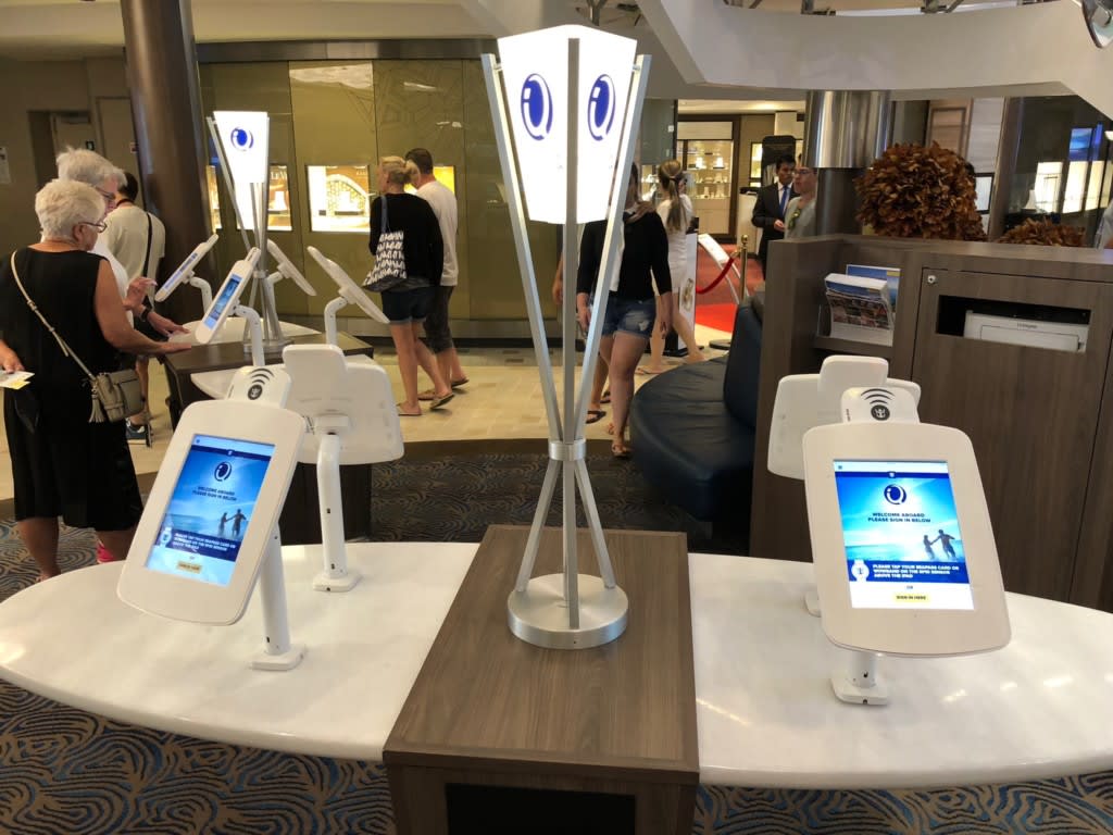 ハーモニーに乗船後も船内で申し込みは可能だと思います。申し込みは、専用アプリ、客室のテレビ画面での操作、またはデッキ5プロムナードの船首方面にある『寄港地観光案内』↓のタブレットでもできます!