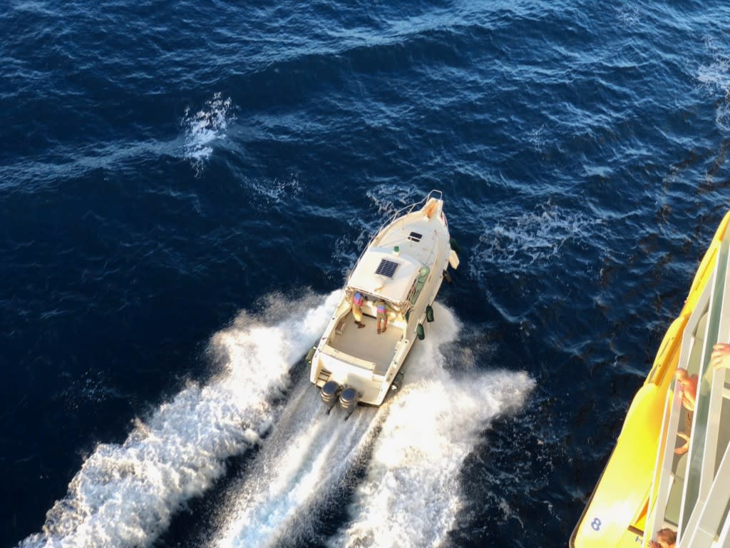 食事が終わる頃には、ファルマス港に近づいてきていました。このクルーズ旅で初めてタグボートをみましたよ〜。