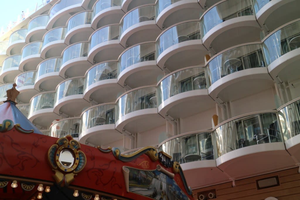 ボードウォークを見ると内側のバルコニー付きキャビン(客室)があり、下(ボードウォーク)を眺めながらバルコニーで新聞を読む人、椅子に座ってウトウトしてる人など見かけました。