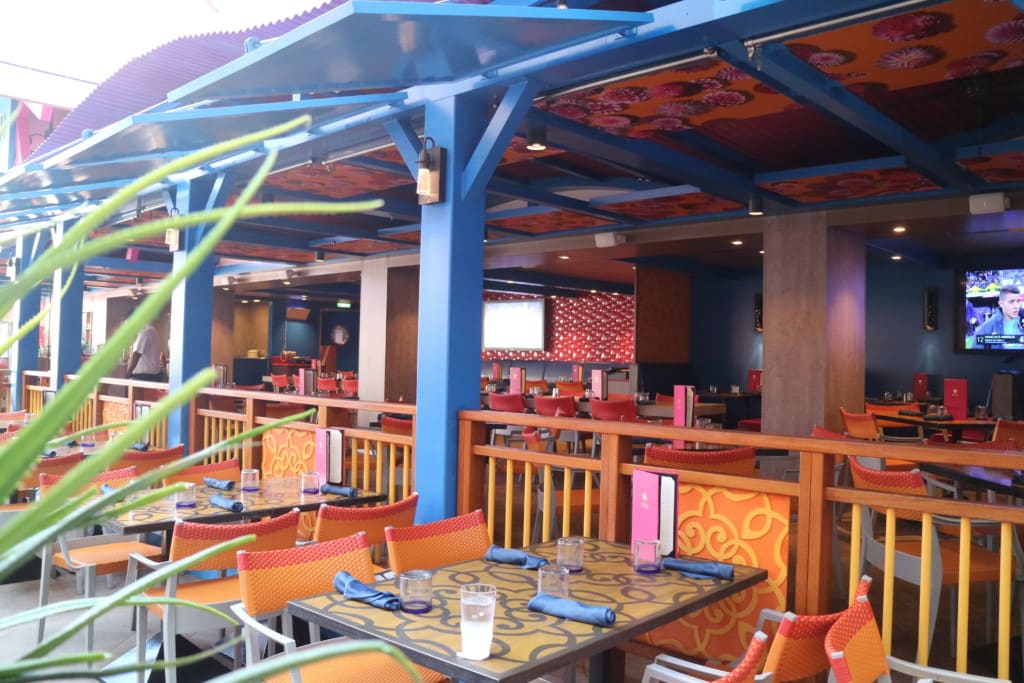 カラフルな店内とボードウォークに出ているテーブル席は風に吹かれて気持ちよさそうでした。昼間よりも夜お酒を楽しんでいる大人たちで賑わっていました。