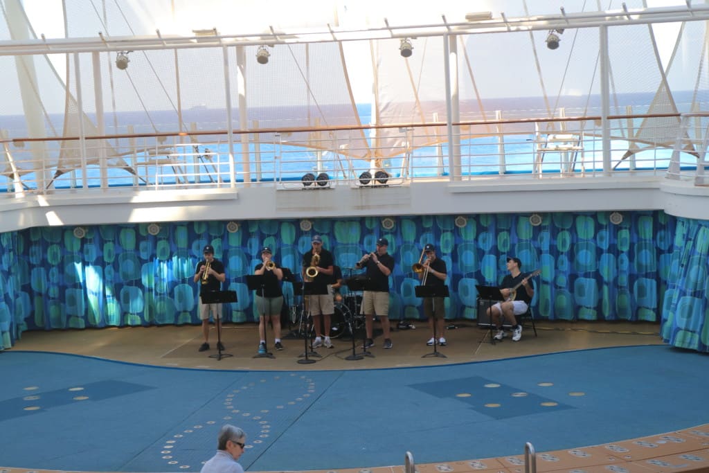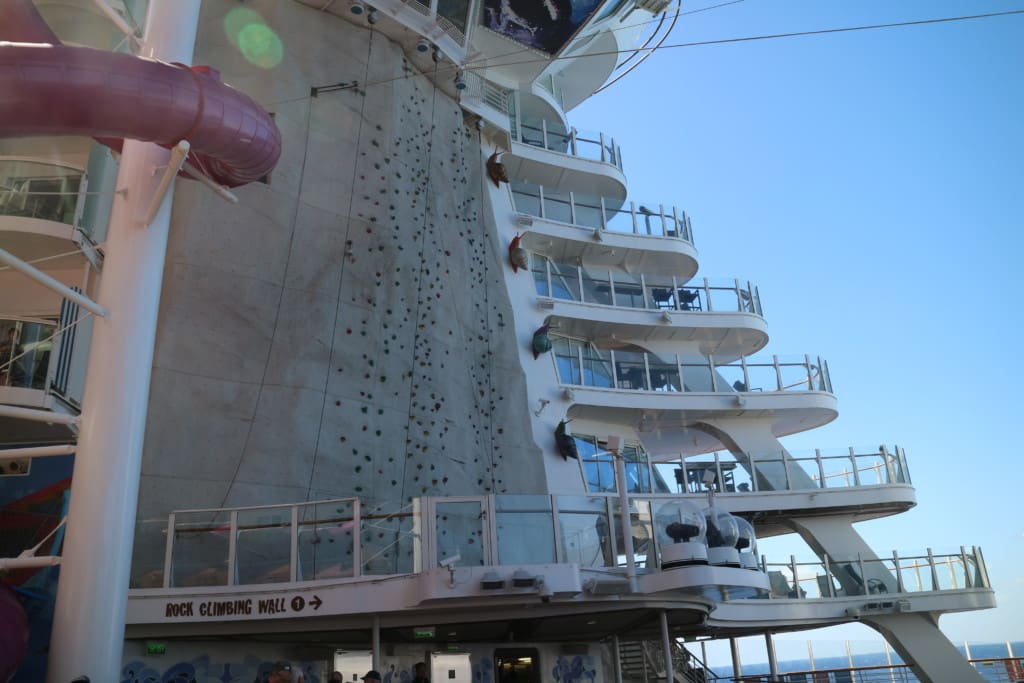 船尾に面しているロッククライミングは右舷左舷の両側にあります。思ったよりいつも混んでいませんでした。それもそのはず、船が揺れたりすると営業時間を短縮していたようでした。一日中クローズの時もあったみたいです。「今日はオープンしてるな」と思い主人がチャレンジしようと行くと「今日はこれで終わり」って、営業時間短縮で終了。