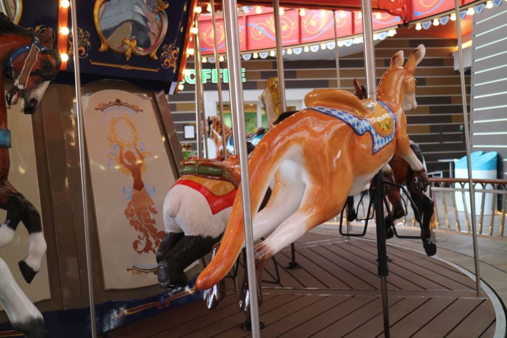 『海辺の散歩道』と言うよりこじんまりとしたプチ遊園地のよう。コーヒーショップ、ホッとドック、キャンディショップなどがあるエリアです。船の上に回転木馬ってさぁ〜!その発想がすごい。ボードウォークのシンボルです。