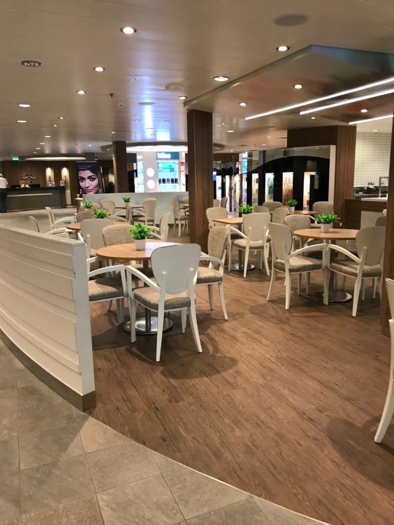 デッキ6が入り口のVitality SpaはFitnessと同じ入り口で奥の方で左右に別れています。この写真に写っているエリアはVitality cafeといってヘルシーなサンドウィッチ、フルーツ、フレッシュジュース、スムージーなどの軽食が食べられるカフェです。