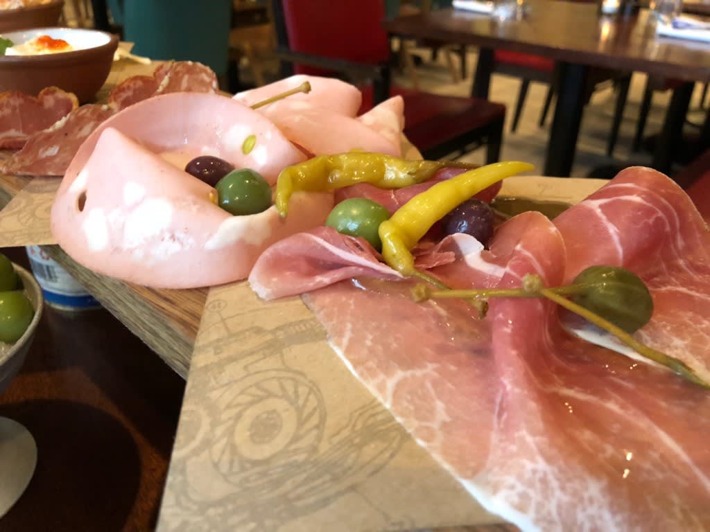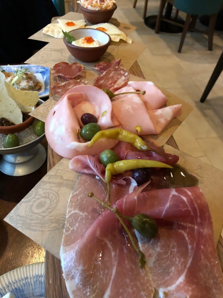 アンティパストのcured meat plankはテーブルの幅より広い板の上に盛られた数種のハム類!