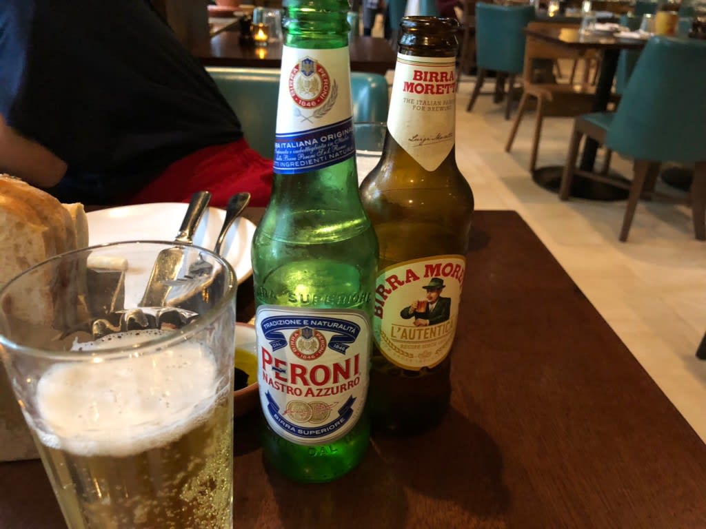 イタリアビールのペロニービール&ビッラ・モレッティで乾杯!ビールはなんとなく選んだもので銘柄指定ではありません。