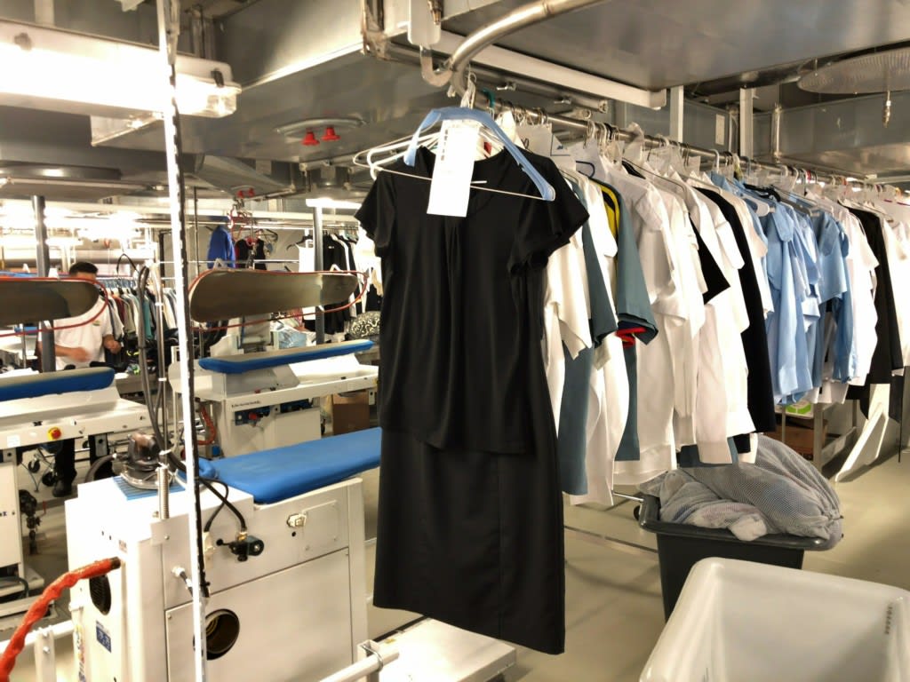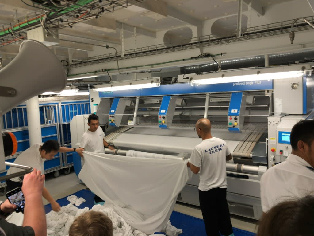 階下のランドリールームは船の中とは思えない程広くまたアイロンの熱や湿気で暑い作業場でした。シーツのプレス作業はテレビでも放映されていましたね。