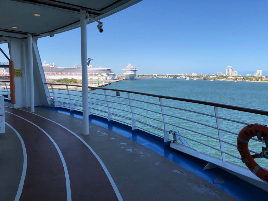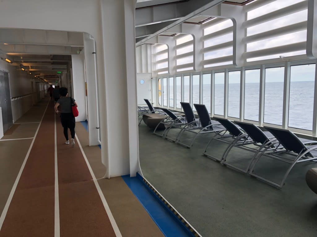 お天気が良かった出港日の船尾付近のジョギングトラック。外の景色を眺めて走ったり歩いたりできる爽快感!