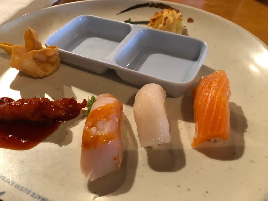 握り寿しは生魚に見えますがオイルに漬け込んであるのか、そういう処理なのかはわかりませんが魚独自の脂とは別のアブラっぽさがありました。でも海外で食べる日本食にしてはかなり日本に近かったです。