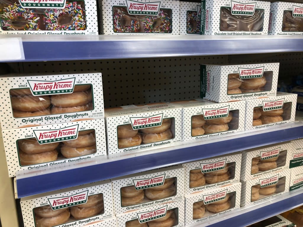 クリスピークリームのドーナッツが箱入りで既製品菓子のように積まれている様に驚き…。見ている側からどんどん買われていきました。