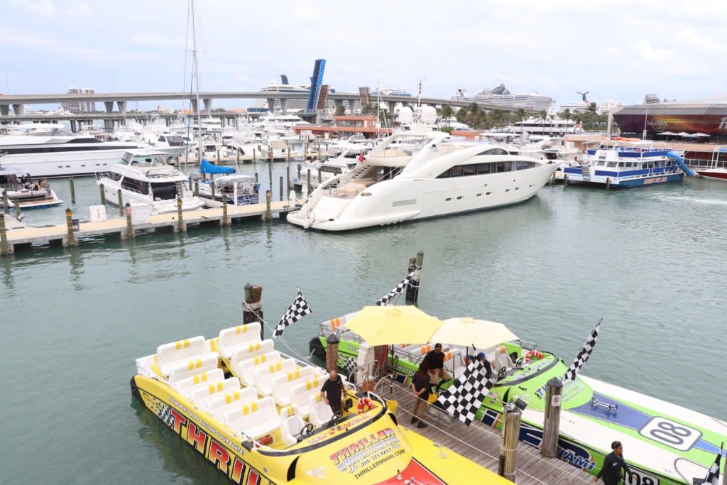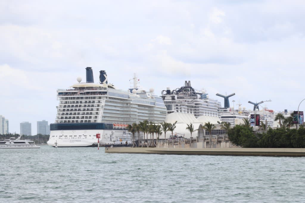 湾内をクルージングするクルーザーがこれから出航するところでした。イケイケなバブリースタイルのお姉さんたちが続々と乗船していました。↑写真の奥の方にセレブリティやカーニバルのファンネル(煙突)が見えるところがマイアミ港のクルーズターミナルのようです。