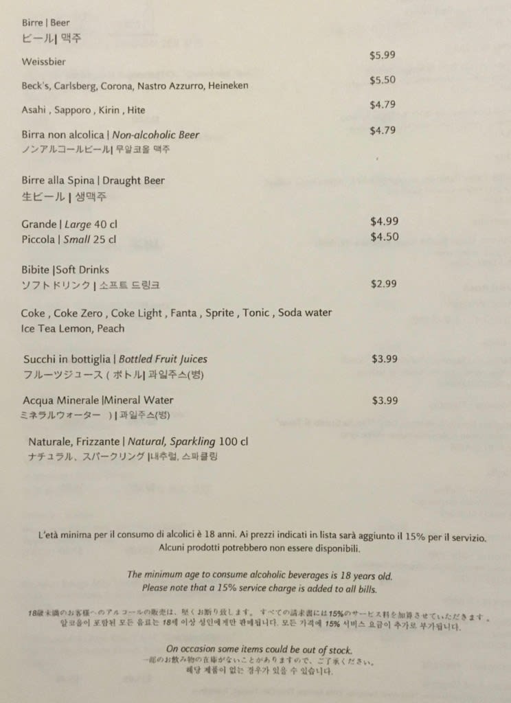 コスタネオロマンチカ船内で飲料の注文をすると、飲み物代の他にサービス料15%が別途かかることになっています。(各メニュー表に記載あり)