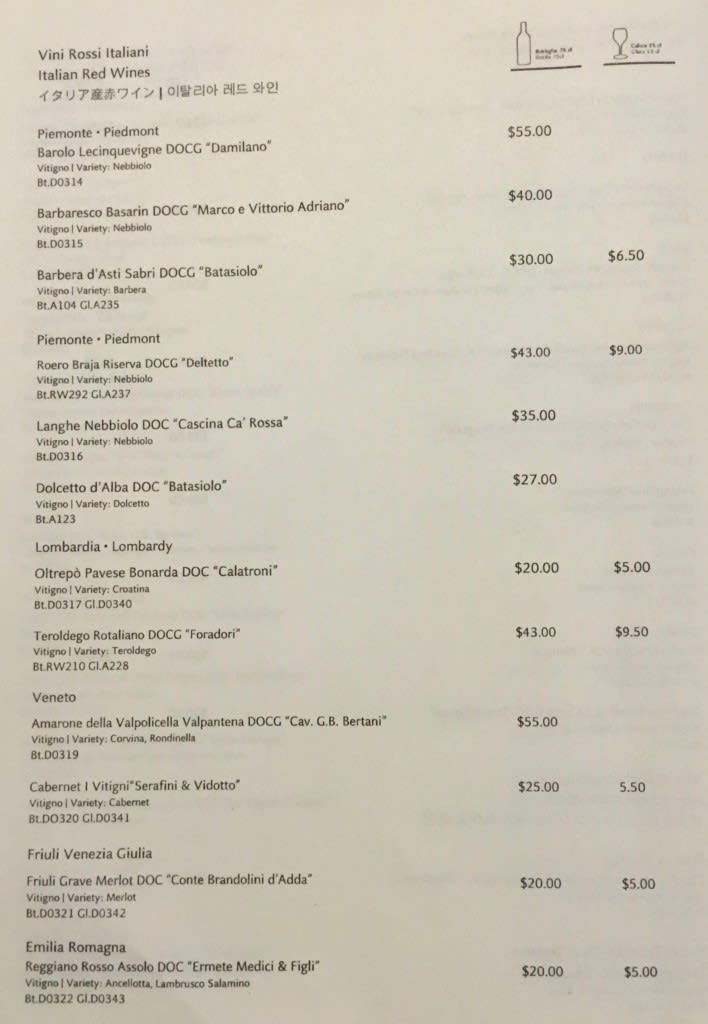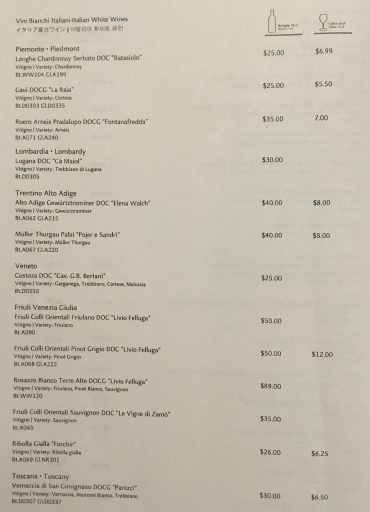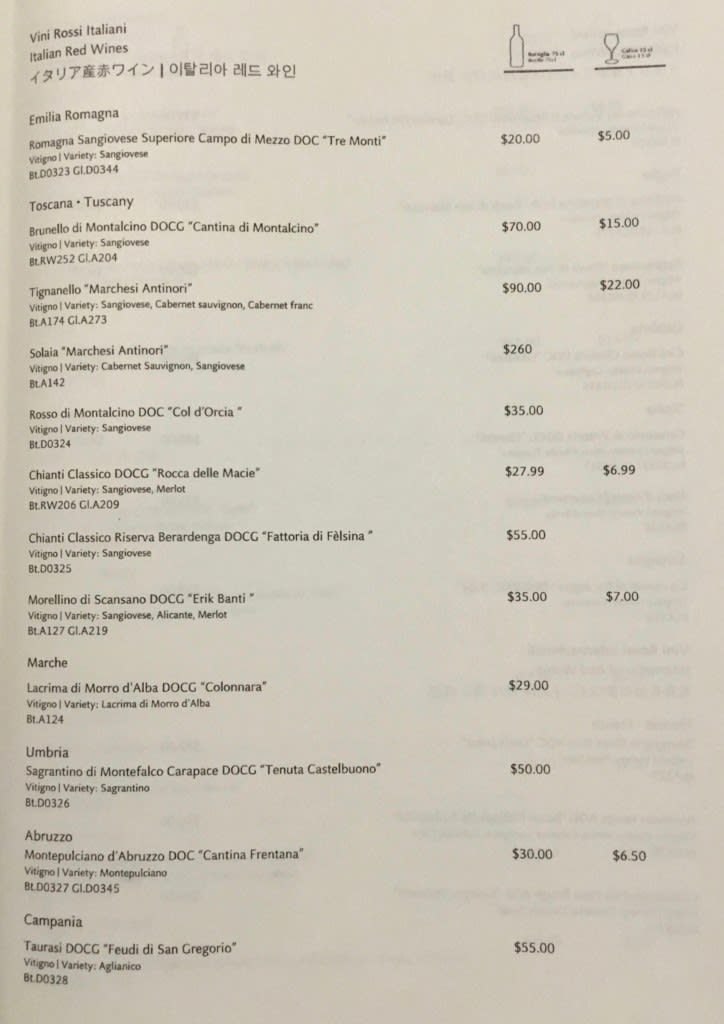 シャンパン・ワインがメインのドリンクメニュー、↑こちらはワインバーのエノティカ・ベローナに置いてあったメニューです。メインダイニングのポッティチェッリには赤い表紙のものが置いてありましたが内容は同じでした。