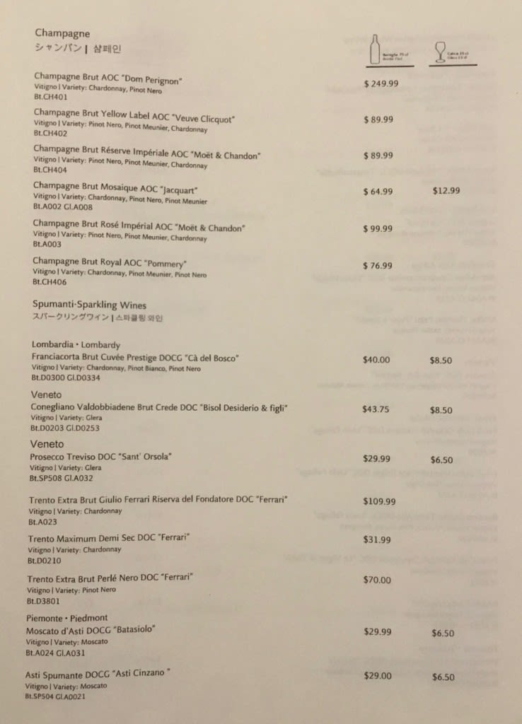 ブッフェでもスパークリングワインを注文できますが1択のみ。上記ドリンクメニューがあれば6.5〜8.5ドルのグラススパークリングが選べます。