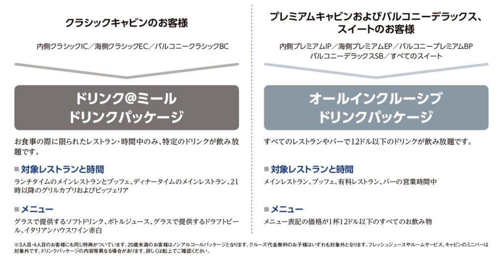 オールインクルーシブドリンクパッケージ(上記表参照)ではサービス料15%を含む12ドル以下のドリンクが飲み放題なので、1杯あたり約10.4ドル以下であれば飲み放題内となります。