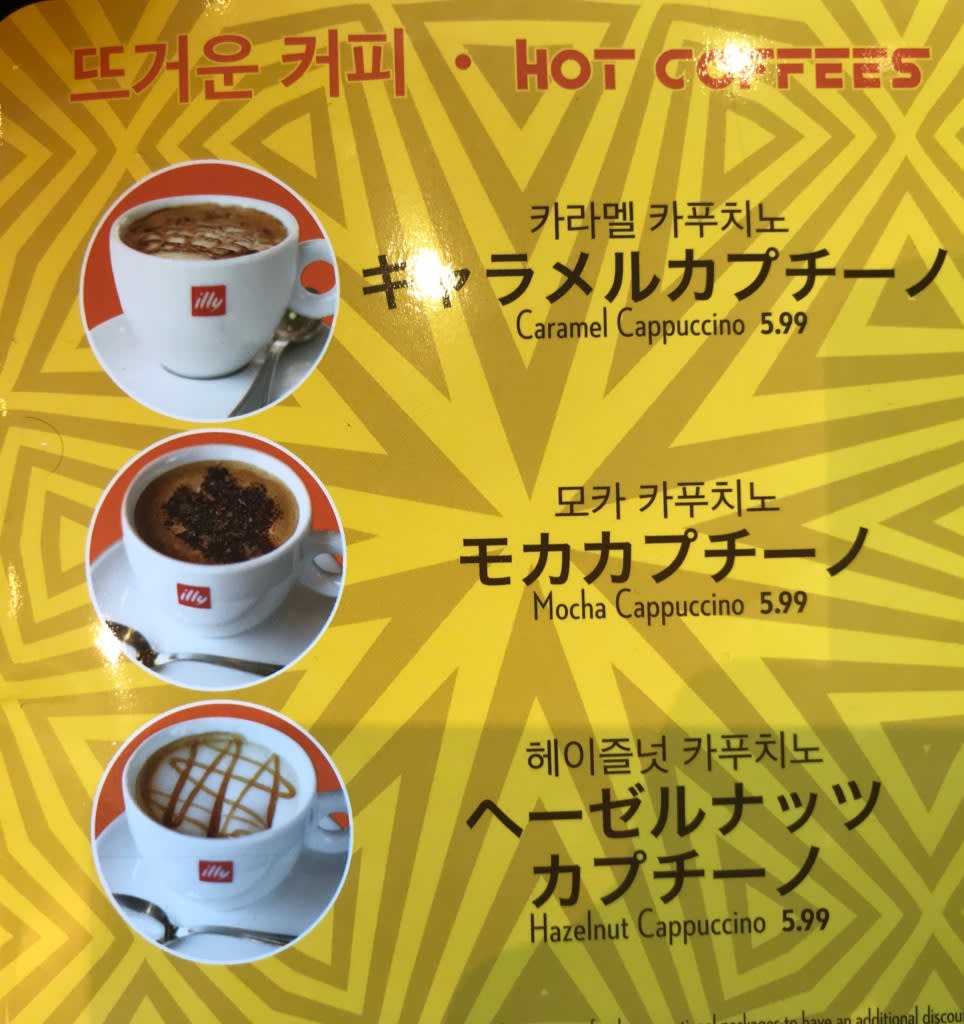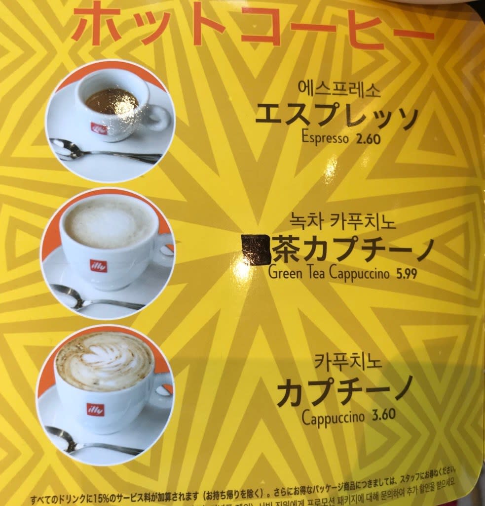 サービス料15%を加算しても全て12ドル以下です。このカフェにメニューはデッキ8グランバーピアッツァイタリア、デッキ9コーヒー&チョコレートバーに置いてありました。