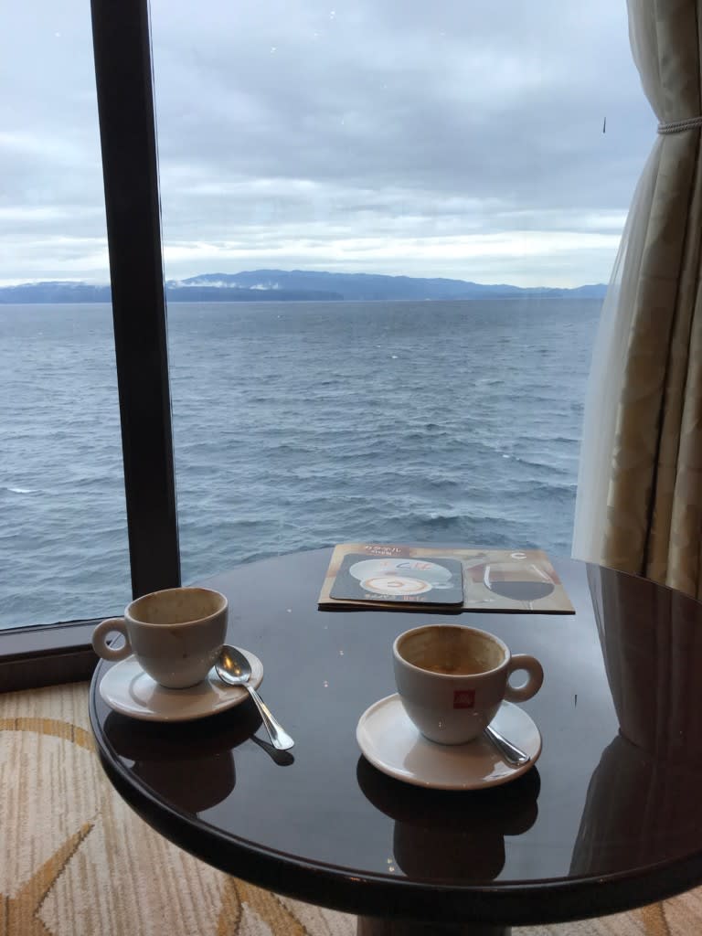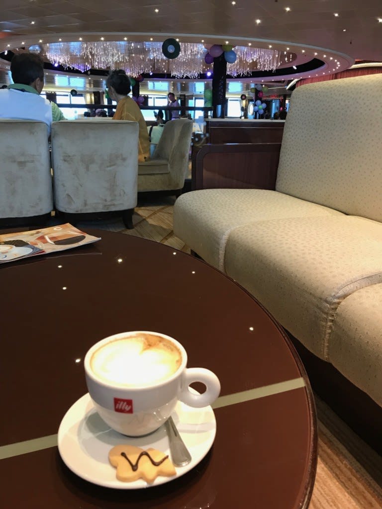 終日航海の日は午前中からデッキ8グランバーピアッツァイタリアでは窓際の席が埋まり、コーヒー類やカクテルを飲んで過ごしている方が多かったです。
