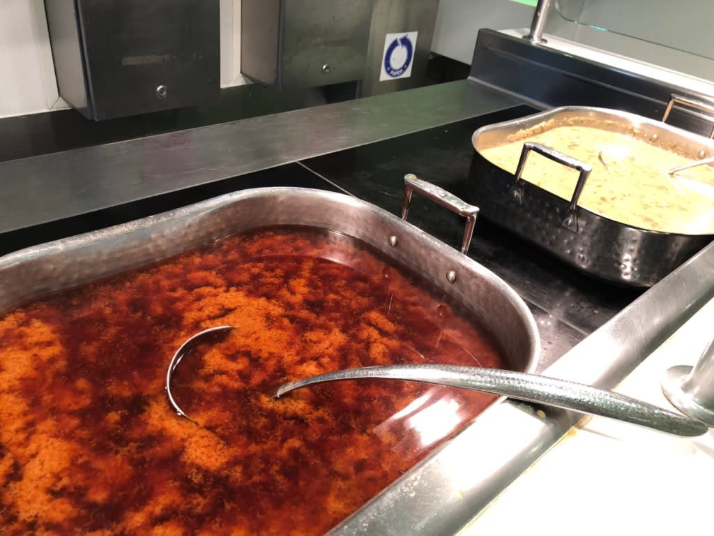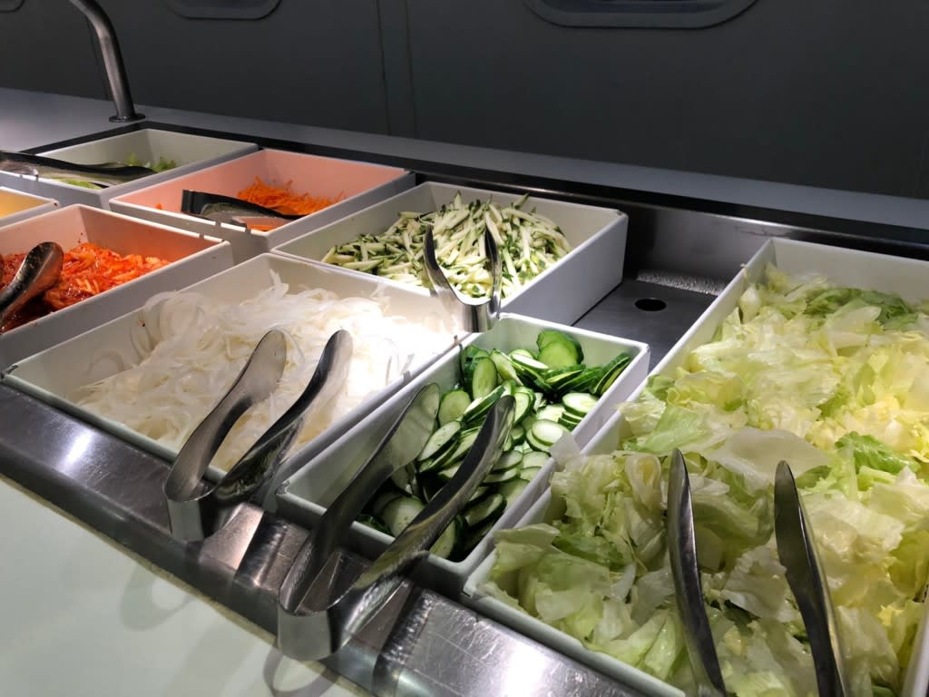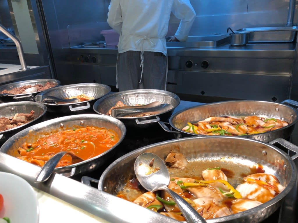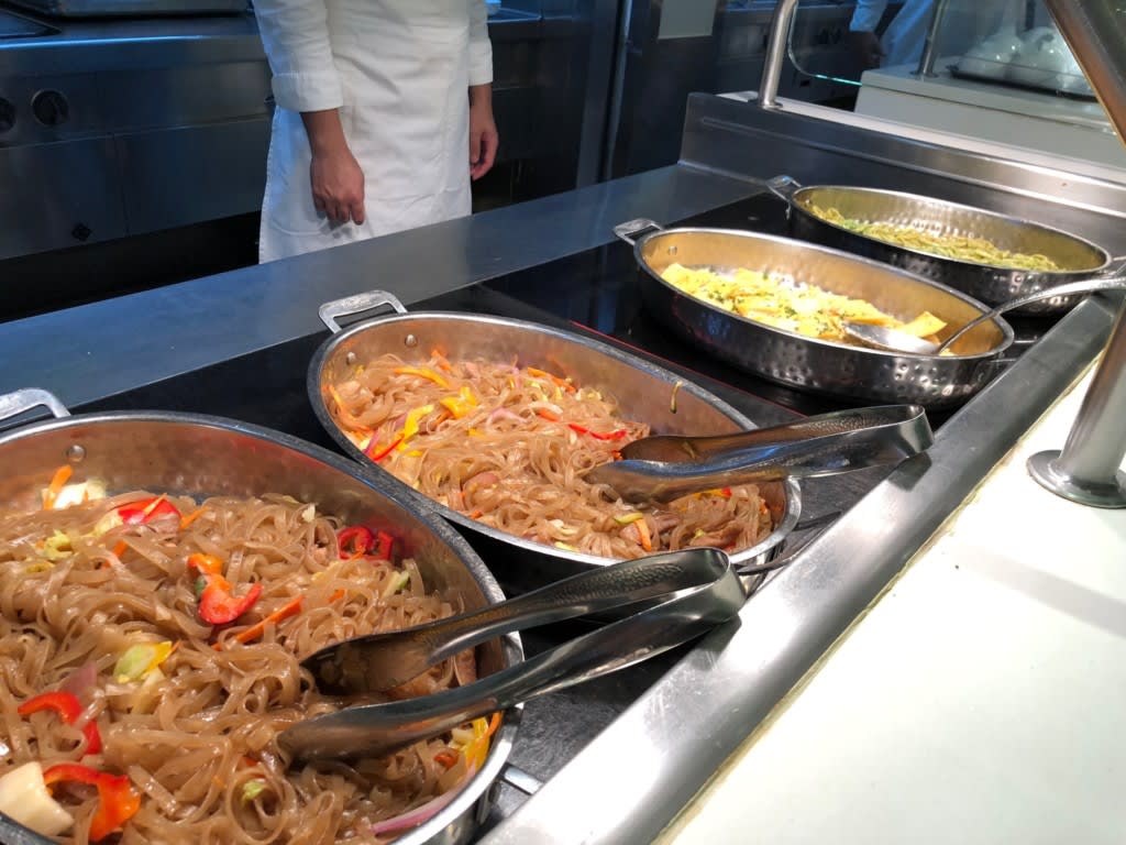 手前のこんにゃく麺のようなチャイニーズヌードル(?)は主人が気に入っていました。毎食のように出ていましたね。パスタも常時2種類はありました。