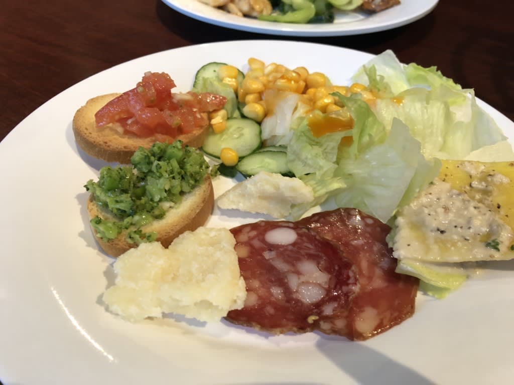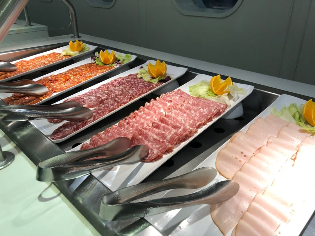 2回目のコスタネオロマンチカ乗船で最初のブッフェレストラン・ジャルディーノでの食事でしたがブッフェカウンターに並んだ時に「料理の品数が減ってる!」と思いました。チーズの種類が1種だけだったのを始め、前回乗船時よりも他の料理も品数が少なくなっていました。