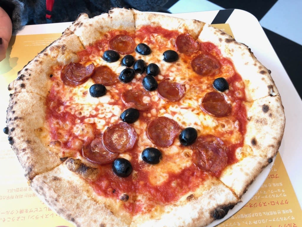 私のオーダーしたピザはカラブレーゼ・ピッカンテ。サンマルツァーD.O.P.トマト(下記▶︎参考)、スパイシーサラミ、オリーブ、チリペッパー。チリペッパー入りですがさほどホットではありません。