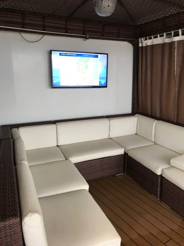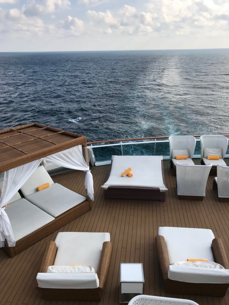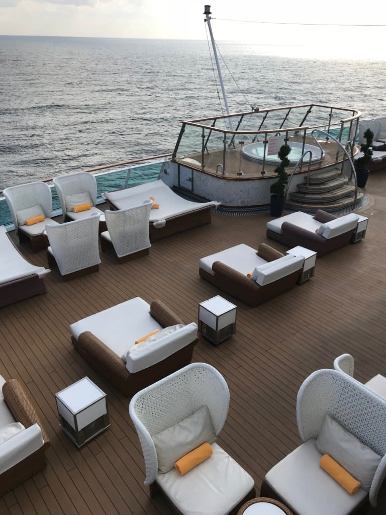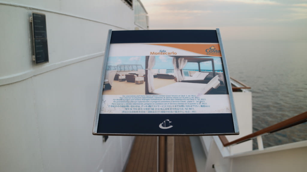 ”ラグジュアリーなデッキチェアが置かれたリドバーモンテカルロ。青い海原に白く輝く航跡を眺めながらジャグジーやラウンジでのんびりすることができます。(コスタネオロマンチカクルーズガイドより)” という有料エリアです。