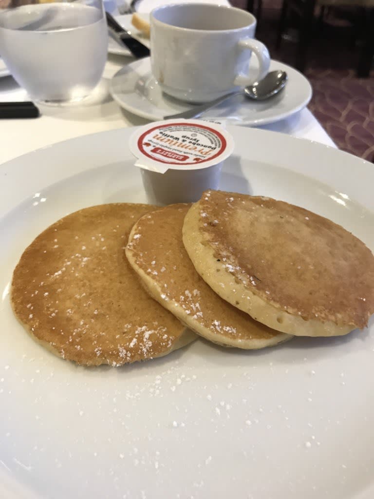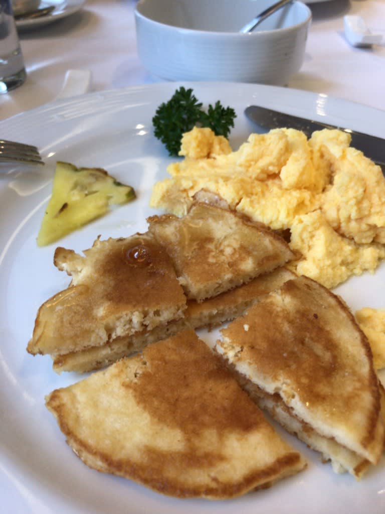 どの船に乗船してもメインダイニングで朝食を取る時はほとんど同じものを選びます。パンケーキはマストです。