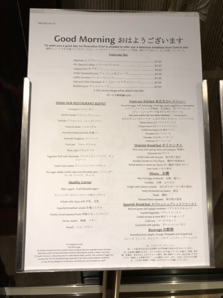 メニューの幅が狭くなりました。ほとんどルームサービスと同じメニューだということがわかります。