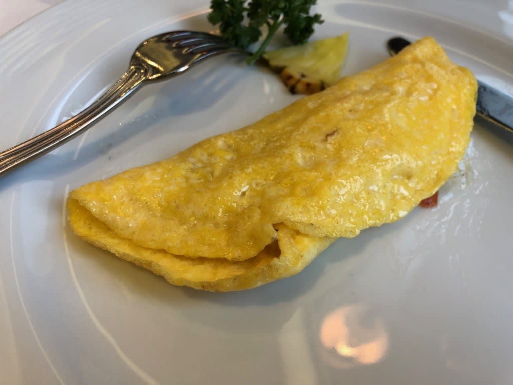 主人が選んだオムレツも卵焼き、という感じです。袋から出したような不自然な形状、これはもしかして湯煎したオムレツではないか?という疑念が…。