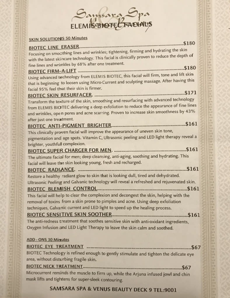 パッケージになっていない施術メニューは英語のものだけでこの時は日本語のメニューはありませんでした。日本発着クルーズだとサムサラスパの受付には日本人セラピストや日本語が通じるスタッフがいるので「フェイシャルが受けたい」「リフレクソロジーが受けたい」というとメニューの説明をしてくれます。