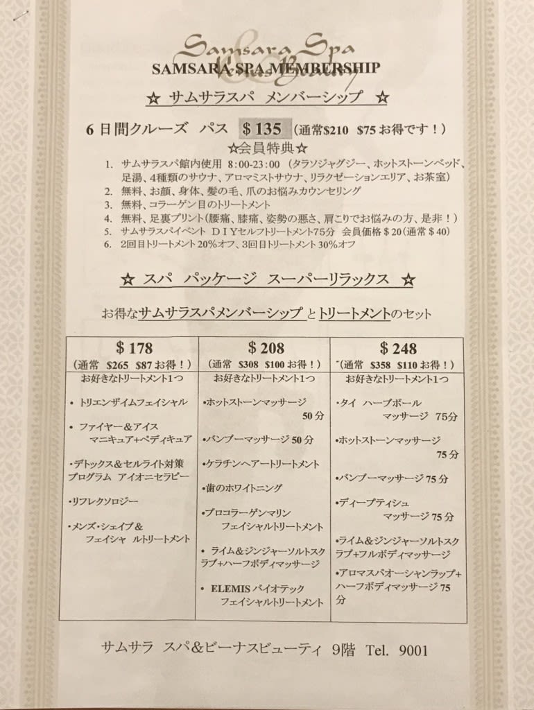 乗船初日に希望日時を取るべく、サムサラスパに出向いて予約した甲斐があり、今回は遅い時間を回避、夕食前の夕方に予約を取ることができました。