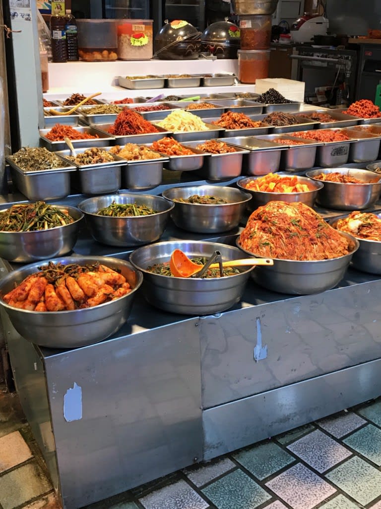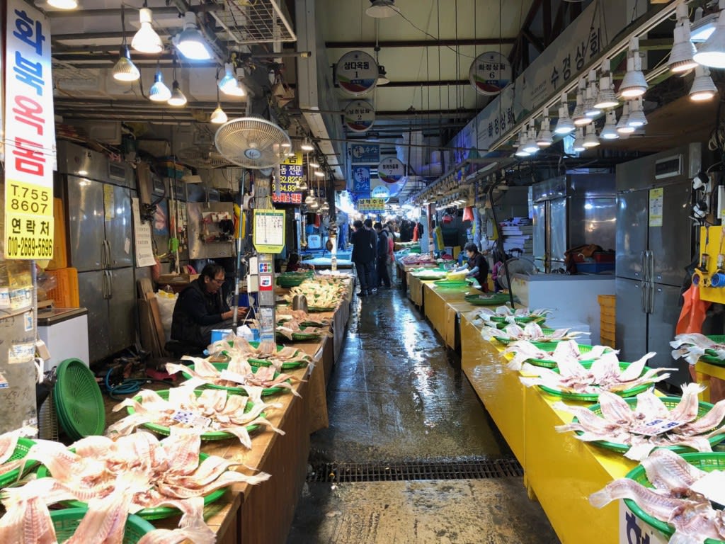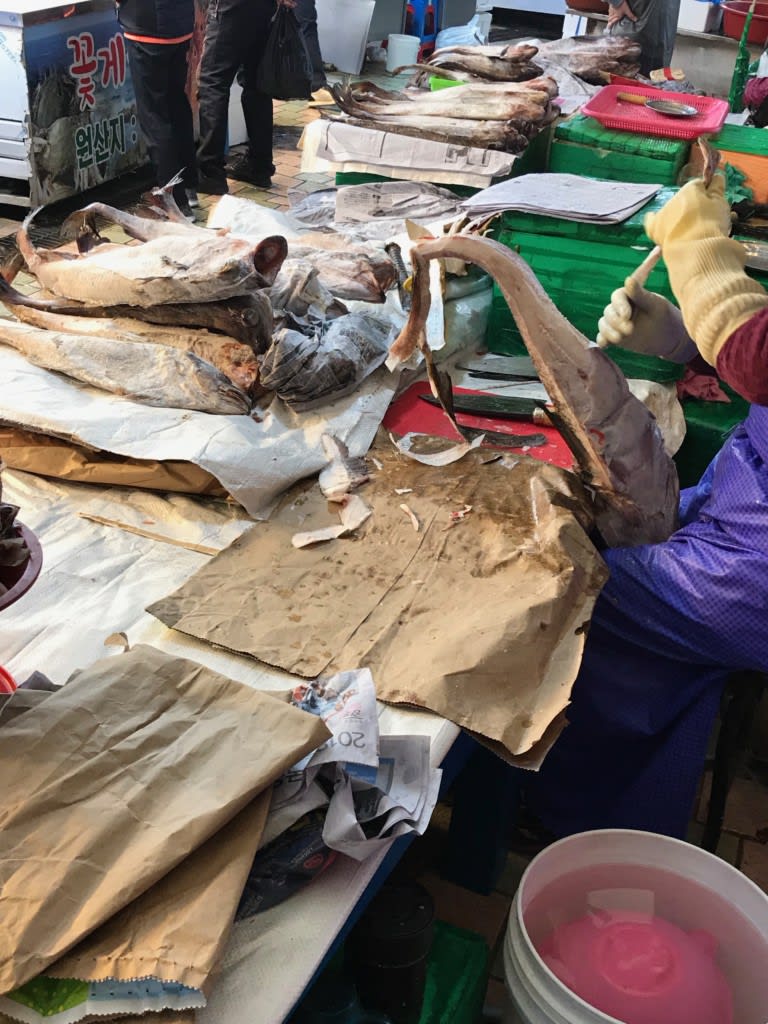 通路で冷凍の魚を加工しているアジュンマが沢山いて、そして同じ魚であるだろう開きが陳列されている様は圧巻でした。