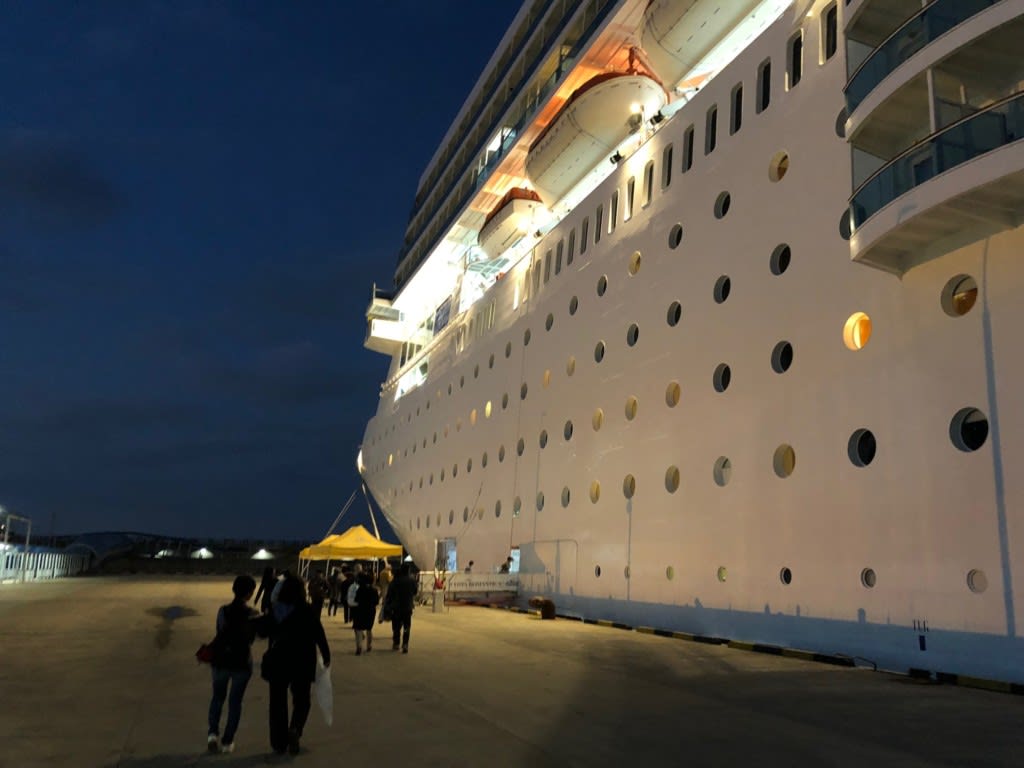 坂の上で写真などに興じているとあっという間に日が落ちて船に戻った時にはどっぷり日は暮れていました。18時過ぎ頃の画像です。