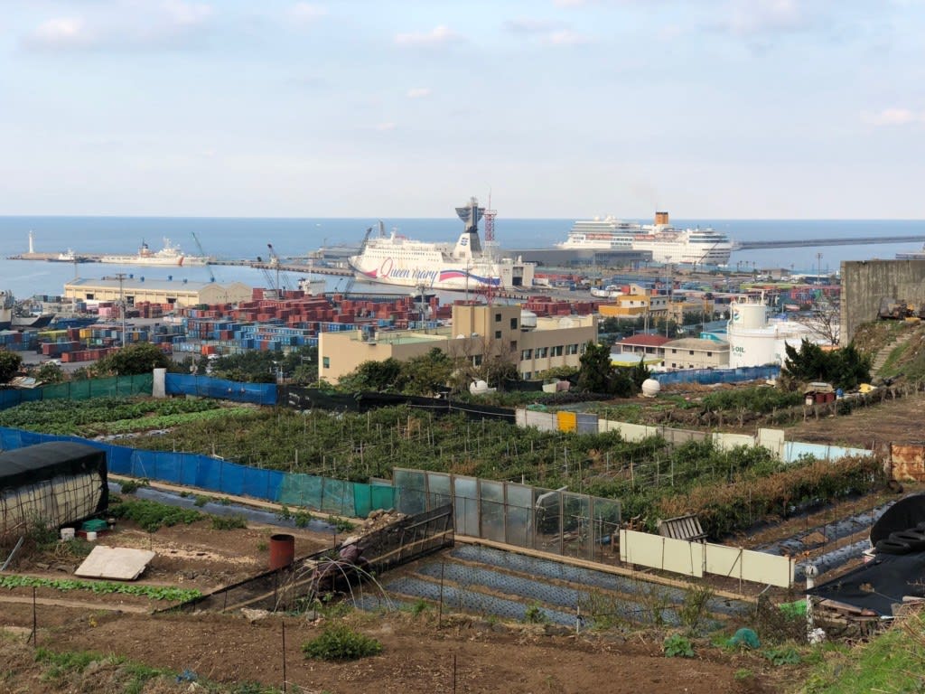 なんと、今まで家ばかりだったのに急に視界がひらけ、海や港が一望できる道に出ました。手前がフェリー、その奥がコスタネオロマンチカです。