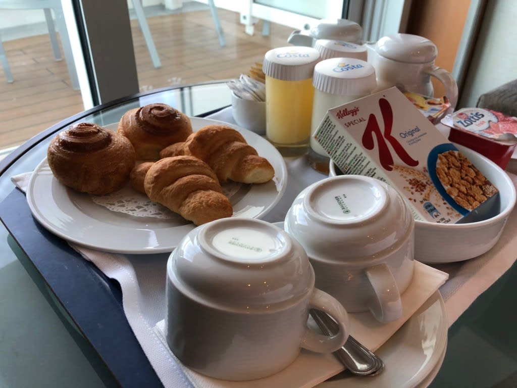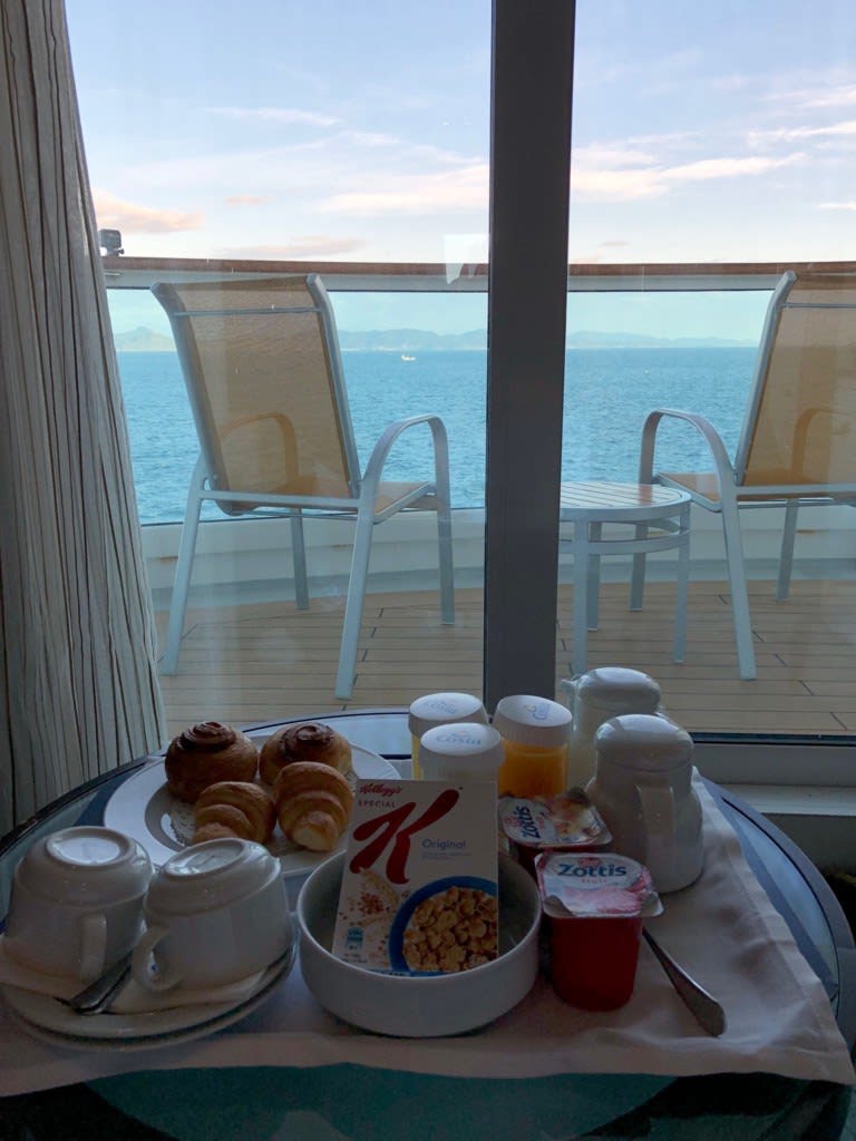 バルコニーへ出ずに窓の手前で頂きました。髪の毛ボサボサで寝ぼけた格好でも食べられるのが超便利な朝食ルームサービス。